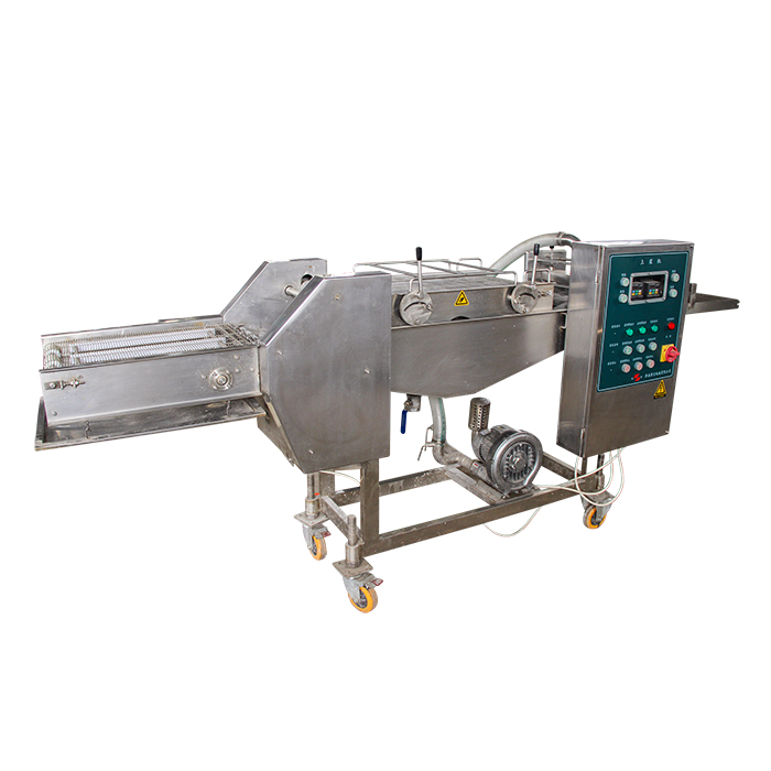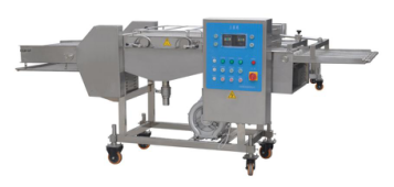 濃漿機(jī)是產(chǎn)品經(jīng)過(guò)上下輸送網(wǎng)帶夾持,在漿液中產(chǎn)品粘附面漿。通過(guò)風(fēng)刀時(shí),多余的漿液被吹落。然后輸入到下一工序。產(chǎn)品適合于天婦羅產(chǎn)品。