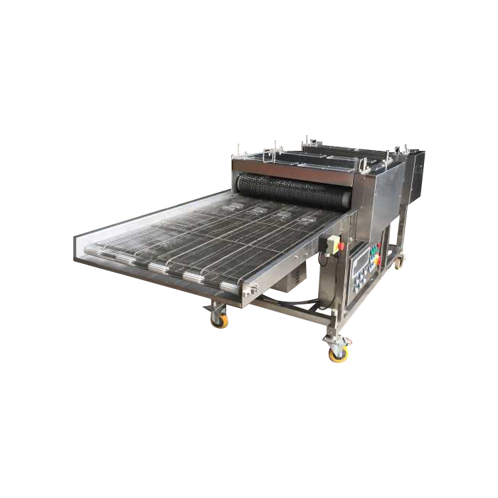 凍肉嫩化和壓延一體機(jī)是用機(jī)械的方法通過兩束多片齒形刀對肉塊進(jìn)行切割,破壞其筋腱和結(jié)締組織,然后將新鮮嫩化的原料肉經(jīng)過2道特制壓輥壓延至規(guī)定的厚度,增加產(chǎn)品的表面積,達(dá)到相同的熟化效果情況下,縮短了油炸時間。雞胸肉嫩化和壓整一體機(jī)是牛排、雞排、豬排理想的生產(chǎn)設(shè)備之一。