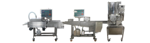 肉餅生產(chǎn)線把混合好的原料經(jīng)過成型,上漿,上康,油炸,速凍等工藝做出不同厚度不同規(guī)格的肉餅。模具可以生產(chǎn)不同形狀的產(chǎn)品(如三角形,橢圓形,卡通雞塊形狀,不規(guī)則形狀)通過模具更換產(chǎn)品。肉排生產(chǎn)線適用于肉類、水產(chǎn)、蔬菜、奶酪以及它們混合料。魚餅生產(chǎn)線的需要配置前處理設(shè)備和后處理設(shè)備:絞肉,混合,油炸包裝等設(shè)備,蝦餅生產(chǎn)線與這些配套設(shè)備組成一條完整的快餐調(diào)理生產(chǎn)線。
