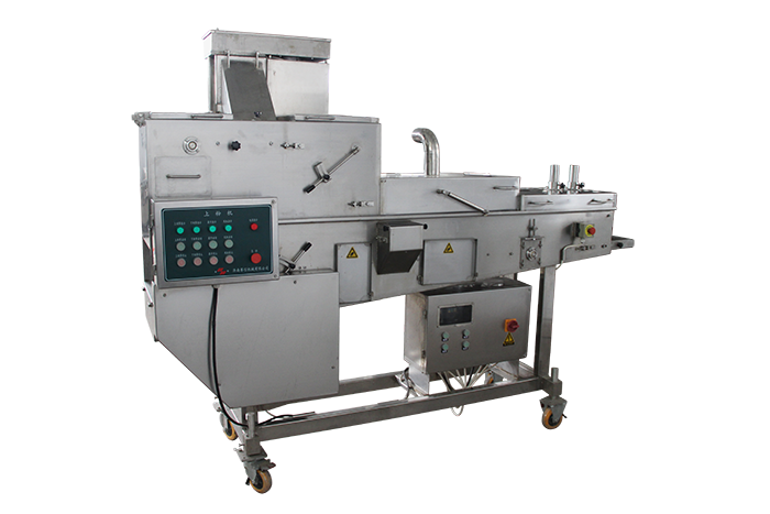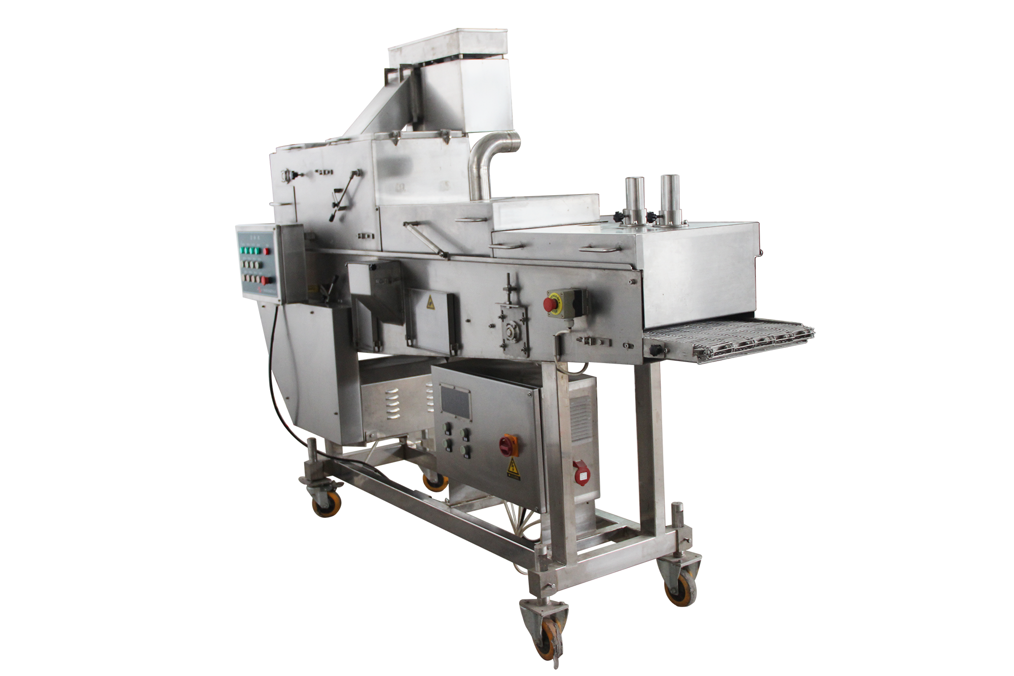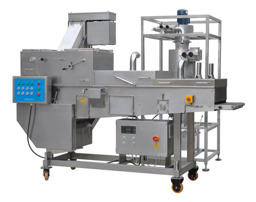裹粉機(jī)能自動(dòng)完成產(chǎn)品的上粉過程,適用于各種預(yù)上粉、混合粉等。產(chǎn)品進(jìn)入下網(wǎng)帶,底部及側(cè)面沾滿粉,從上料斗流下的粉將產(chǎn)品上部覆蓋,經(jīng)壓輥壓緊(上下網(wǎng)帶上的粉厚度可以方便調(diào)節(jié)),上粉后經(jīng)過風(fēng)管,將多余的粉吹落。進(jìn)入下一道程序。產(chǎn)品通過傳送網(wǎng)帶時(shí)被均勻的裹涂上一層混合粉,以適應(yīng)下道工序的要求,可以同上漿機(jī)、上面包屑機(jī)連接,組成不同產(chǎn)品的生產(chǎn)線。從而完成粉、漿、粉,漿、粉及漿、粉、粉工藝。