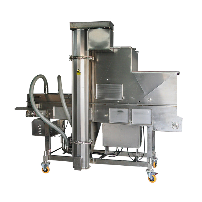 上干面包糠機是產(chǎn)品經(jīng)過輸送網(wǎng)帶,其底部與下輸送網(wǎng)帶上的面包屑粘結(jié);上料斗里的面包屑通過振動篩時被均勻地撒向產(chǎn)品上表面;再經(jīng)過壓輥時,面包屑被壓附在產(chǎn)品上;經(jīng)過風(fēng)刀時,多余的粉被吹落;最后將產(chǎn)品輸送到下一工序。